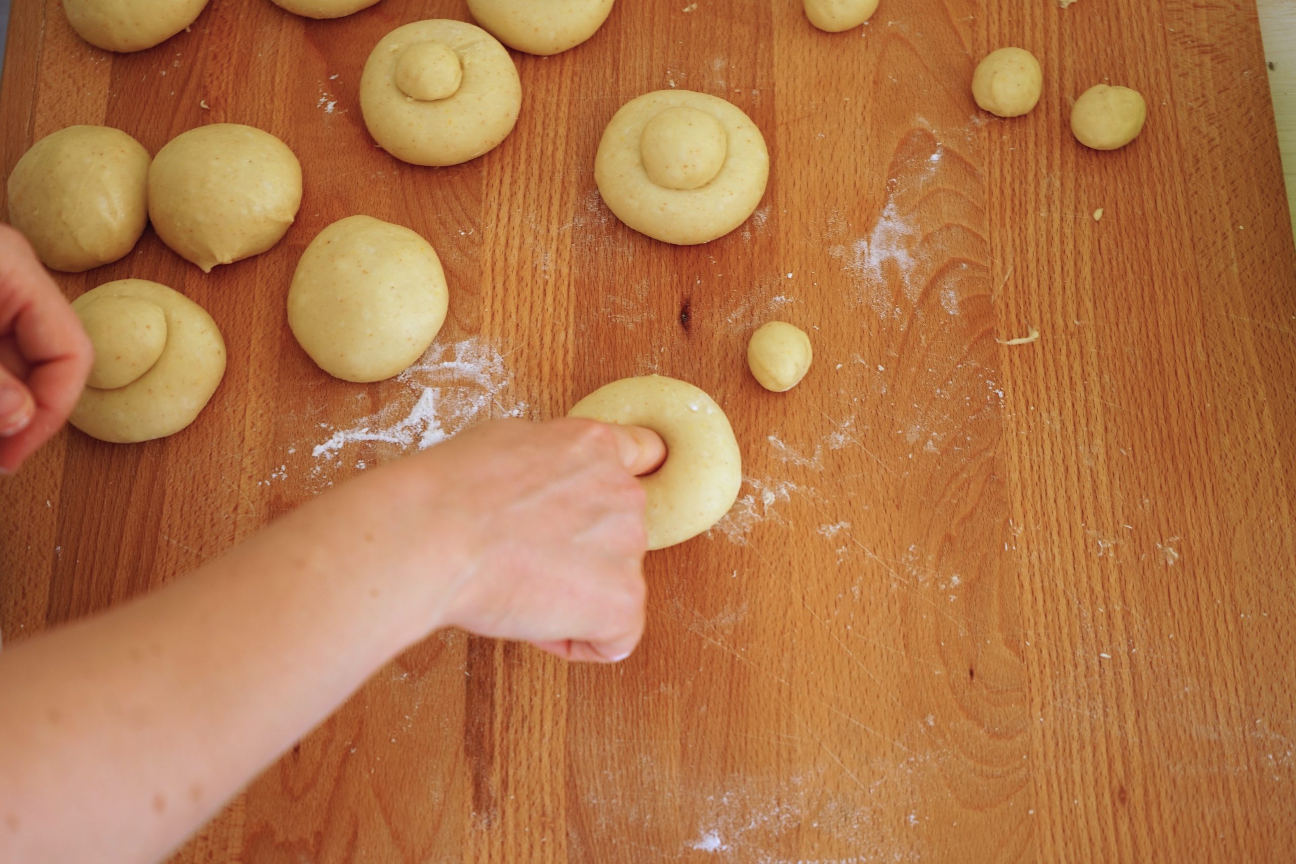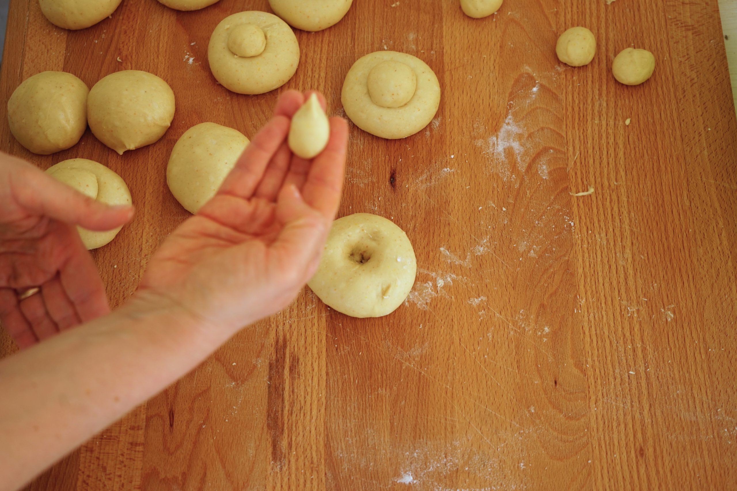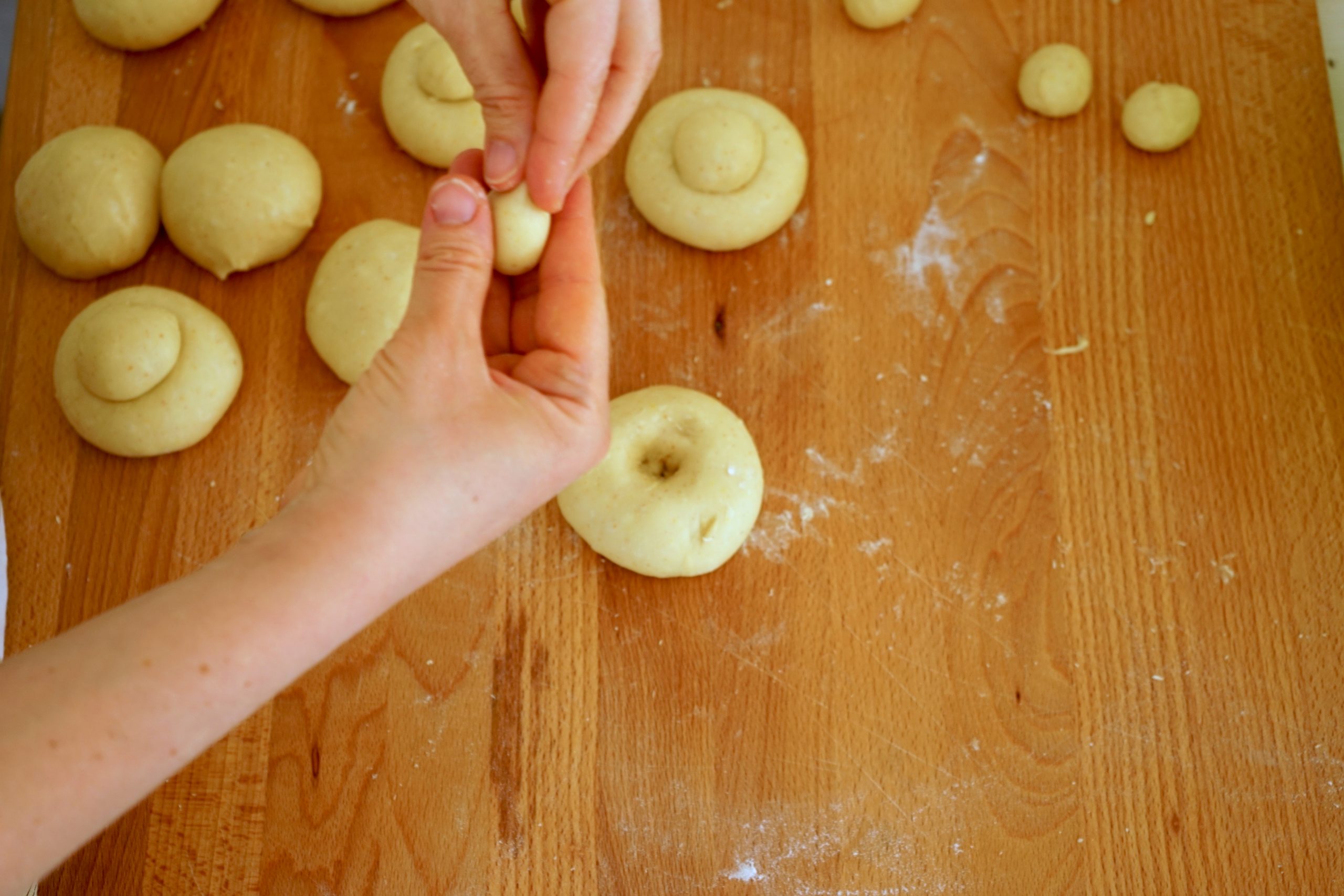 Tenendo la pallina sul piano di lavoro, affonda l'indice in una pallina (1) e rotea leggermente per formare un buco (3).