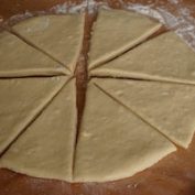 - Con una rotella tagliapasta o con un coltello, taglia prima il disco facendo una croce e poi fai due diagonali, per ottenere un totale di 8 spicchi tutti uguali tra loro.