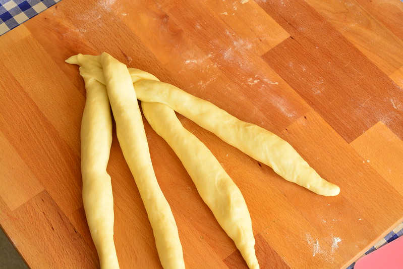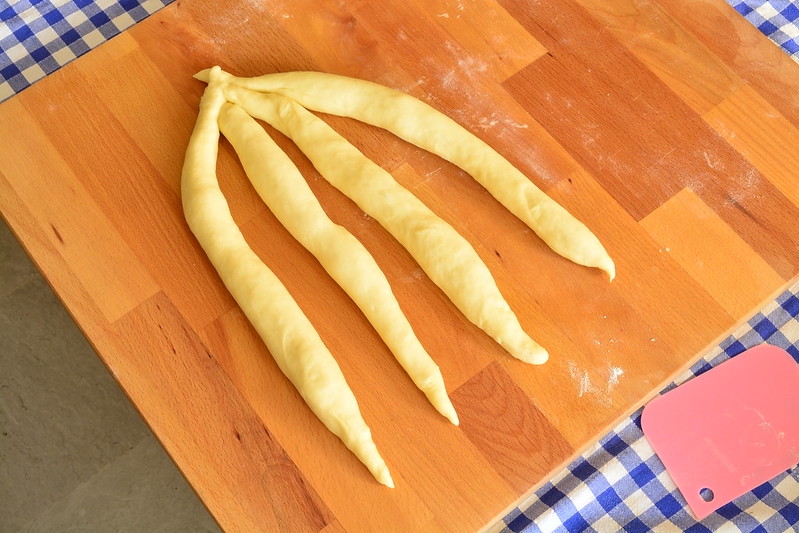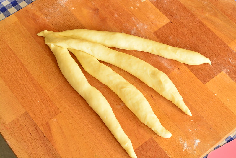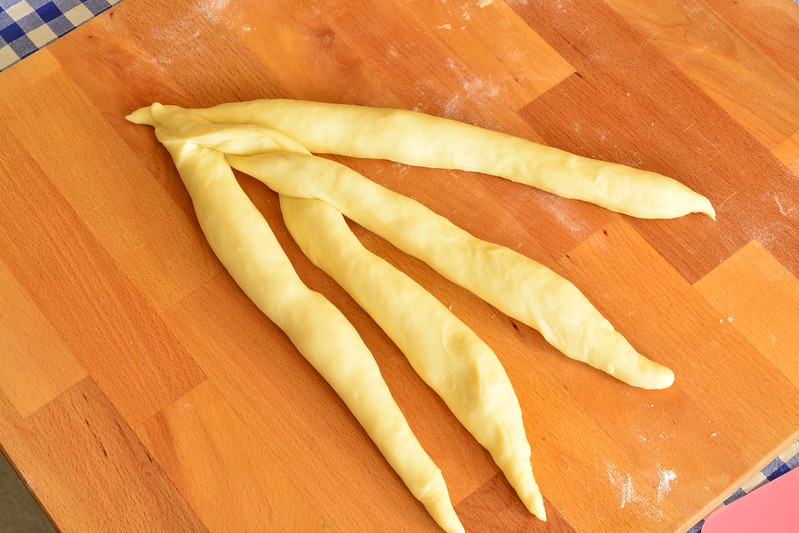 Forma 4 capi di impasto abbastanza lunghi, tenendo conto che si restringeranno un poco perché sono molto elastici.