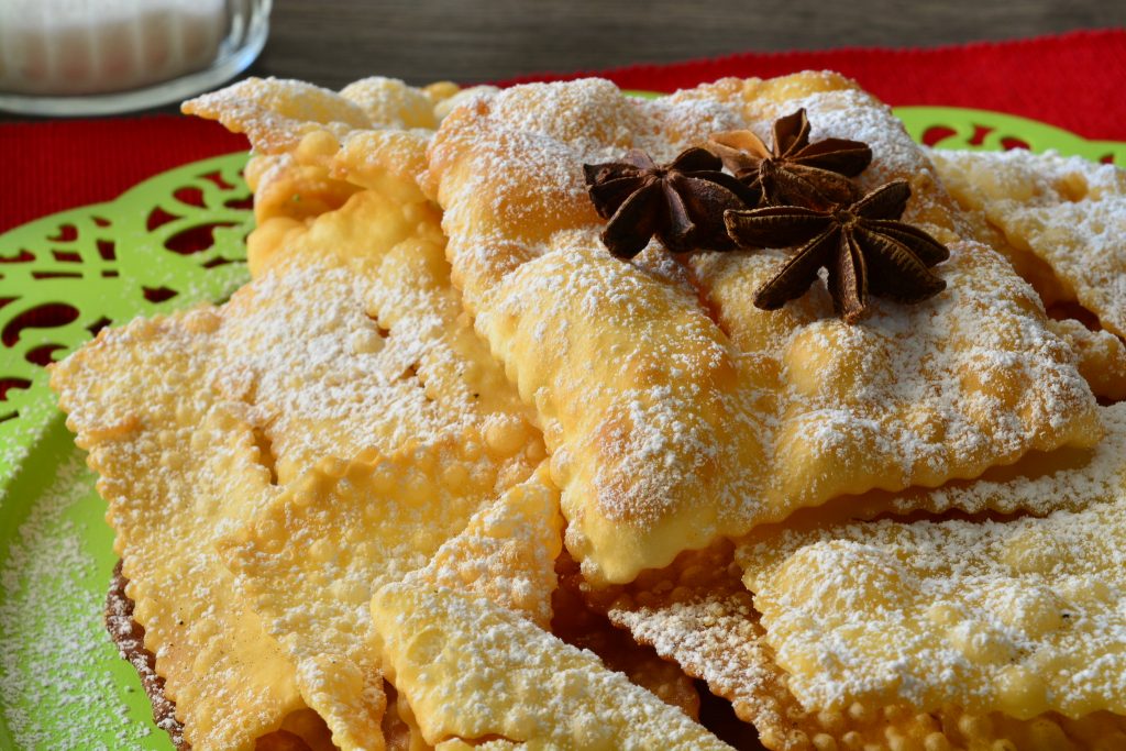 Note come chiacchiere, frappe o bugie queste frittelle sono le protagoniste dei dolci di Carnevale insieme alle castagnole. Si preparano con farina, burro, uova, zucchero e liquore, più un aroma che varia a seconda della tradizione: vaniglia, anice, scorza di agrumi ecc.