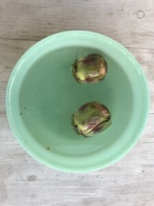 - Pulisci bene 2 carciofi carciofi (togli anche il gambo) e mettili a bagno in una soluzione con il succo di un limone e acqua (1). Tienili a mollo per 10 Min.