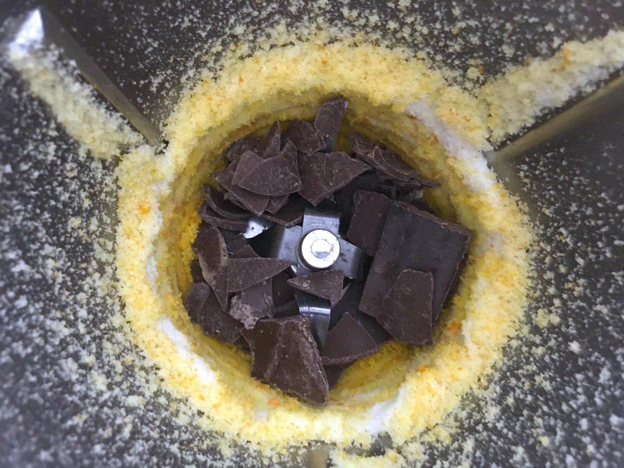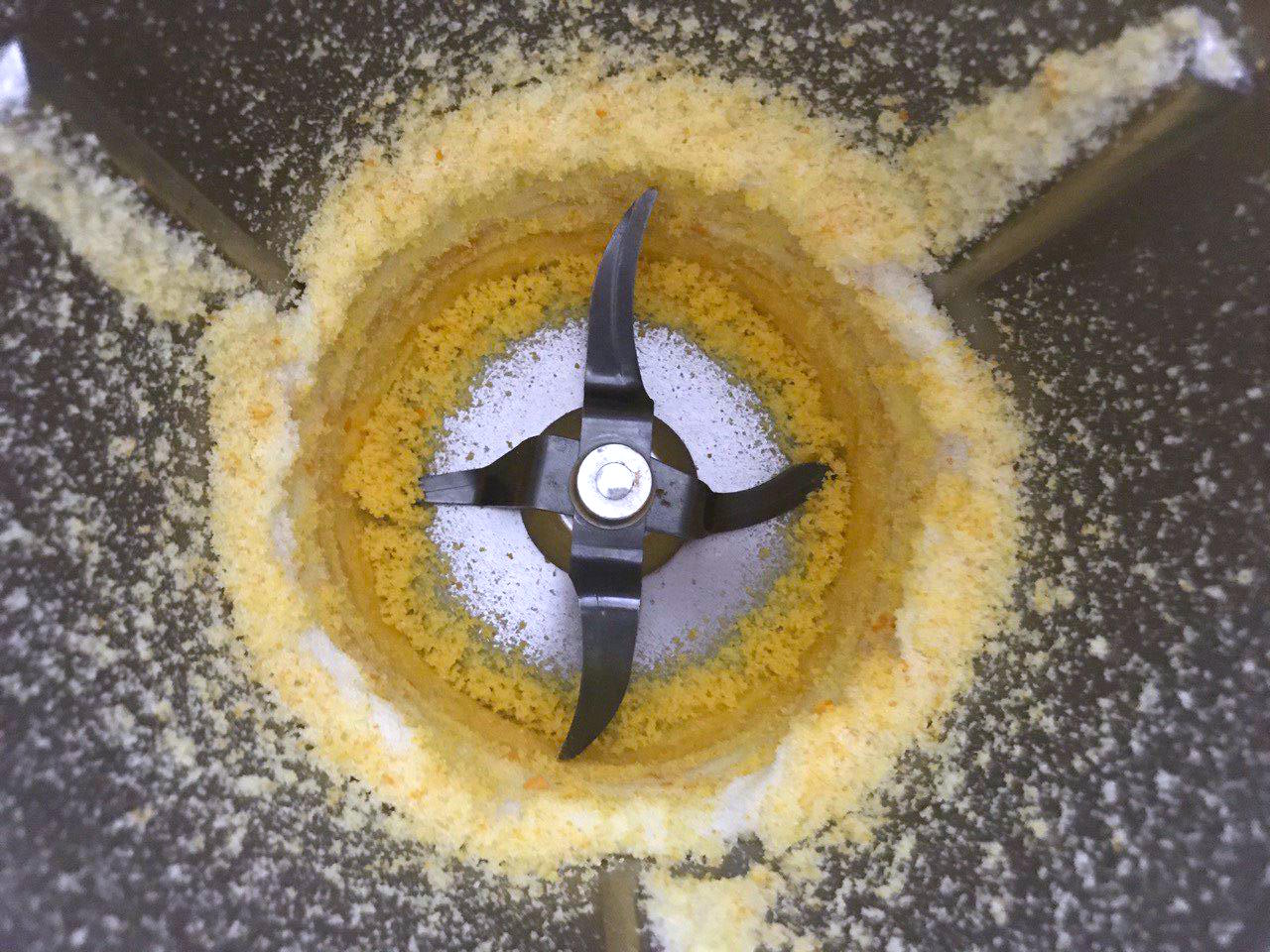 Metti nel boccale la scorza di arancia, 70 g di zucchero e frulla 10 Sec. Vel. 10 (1). Porta sul fondo con la spatola.