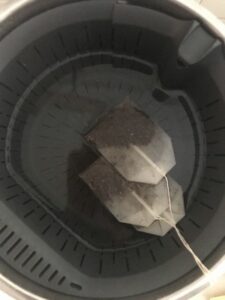 - Metti nel boccale il cestello con 3 bustine di tè (aggancialo con la spatola e lascialo scivolare dentro per non scottarti!). lasci in infusione il tè per il tempo indicato sulla confezione, se lo preferisci leggero, diminuisci il tempo di infusione. Togli le bustine.